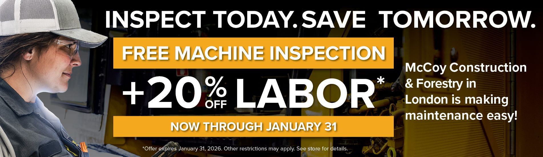 *Offer ends January 31, 2026. Offer valid at McCoy Construction & Forestry LONDON location ONLY. 20% off labor applies only to repairs found during machine inspection. Offer cannot be combined with any other discounts or price reductions. Offer is nontransferable and cannot be applied to previous purchases. Not redeemable for cash or gift cards. Any taxes are the sole responsibility of the purchaser. Void where prohibited or restricted by law. Other restrictions may apply. See store for details.