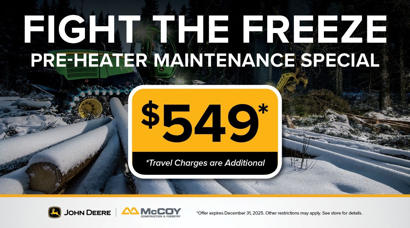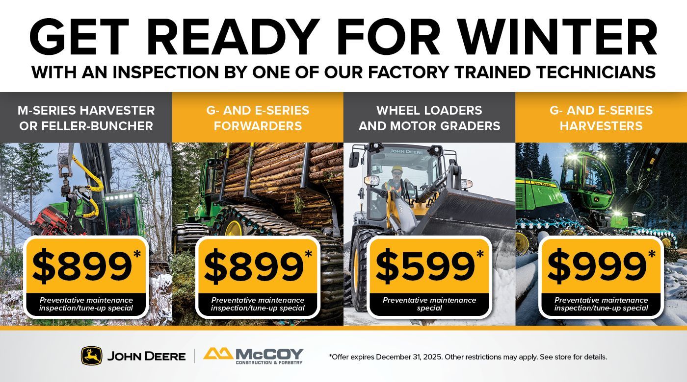 Take advantage of McCoy Construction & Forestry’s Get Ready for Winter Preventative Maintenance Special. Ensure your machines are operating at peak performance and avoid costly downtime during the cold months with an inspection by one of our factory trained technicians. Schedule your inspection today and keep your equipment running strong all season long!