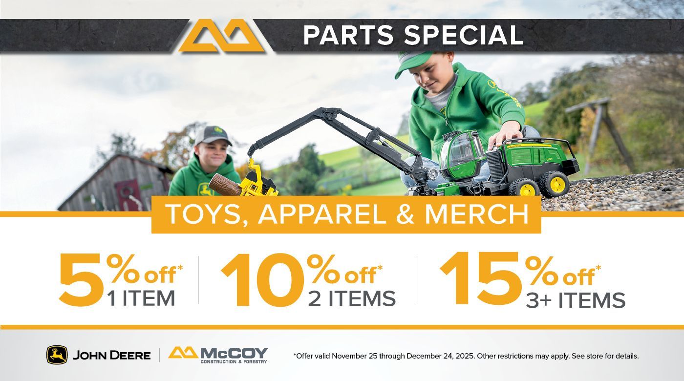 *Offer valid at Wisconsin, Michigan and Minnesota location ONLY. Offer valid through December 31, 2025. Offer cannot be applied to previous purchases. Cannot be combined with any other offers or discounts. Any taxes are the sole responsibility of the purchaser. Void where prohibited or restricted by law. Call McCoy Construction & Forestry for estimate on mileage.
